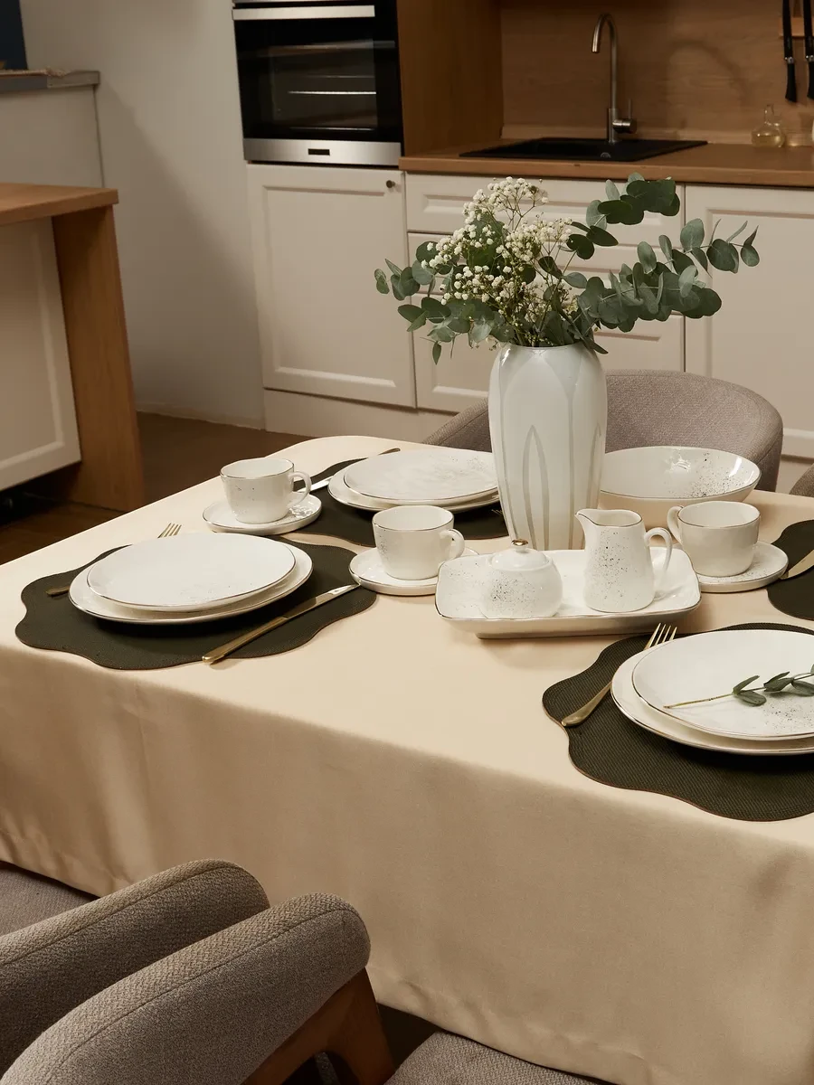Дизайн: тонкая платиновая окантовочная полоса, мелкие платиновые брызги на теле изделий, новые прямые формы.