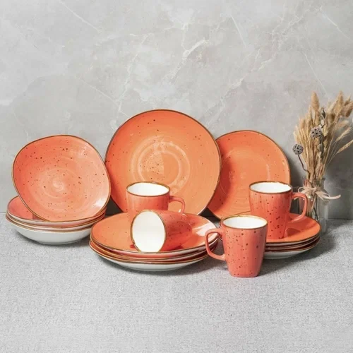 В набор входят тарелки разных размеров, салатники, глубокие тарелки и кружки.