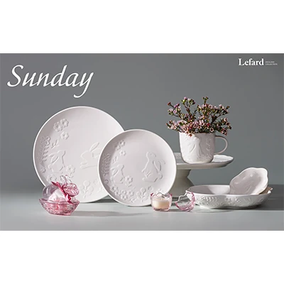 Коллекция «Sunday» от Lefard включает кружки, чайные пары, салатники, блюда для яиц и вазы-подставки из белоснежного фарфора. На изделиях изображены, например, кролики и курочки. Посуда прошла сертификацию, безопасна для пищевых продуктов. Цельные формы можно использовать в микроволновой печи и посудомоечной машине. Крашеные и клеённые изделия не рекомендуется применять в посудомоечной машине и микроволновой печи.